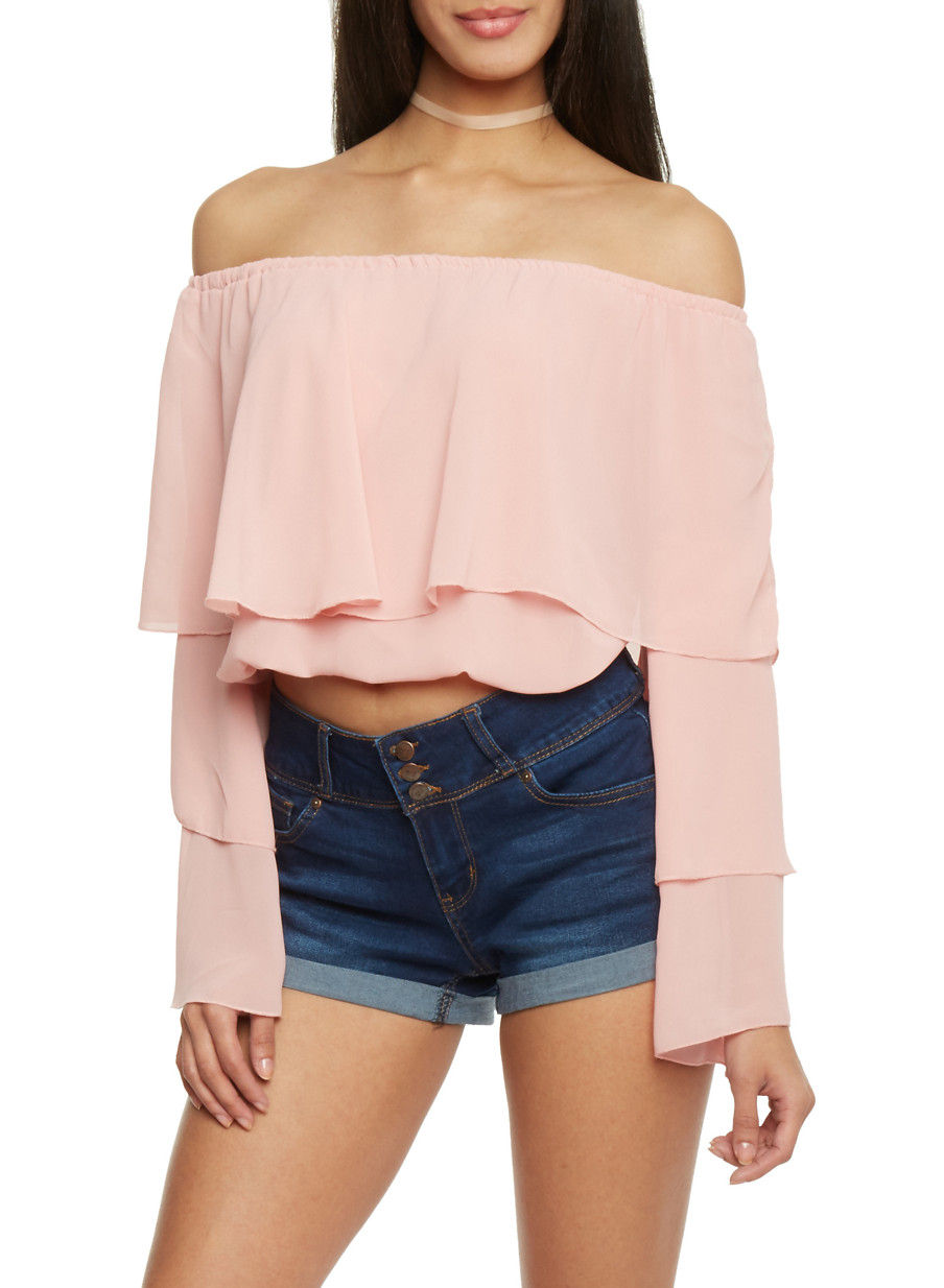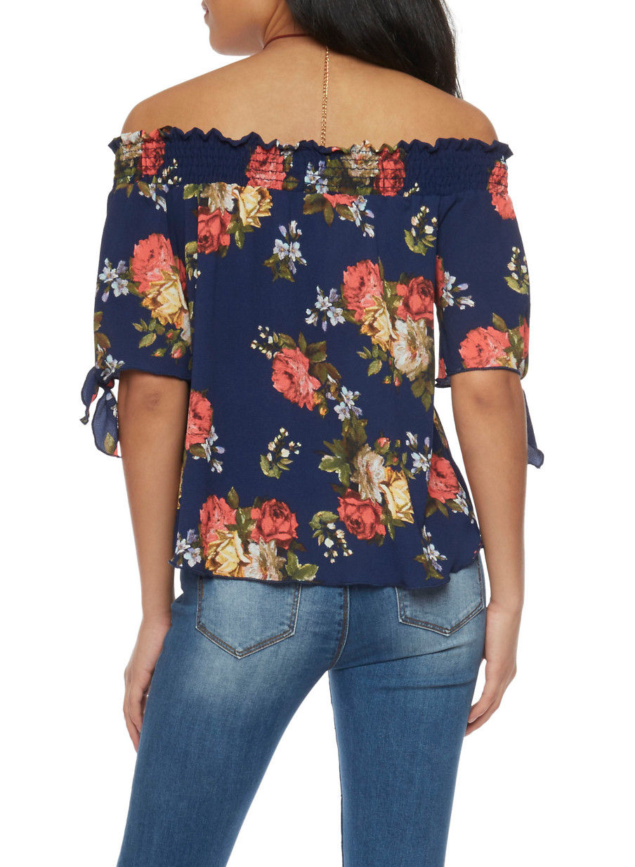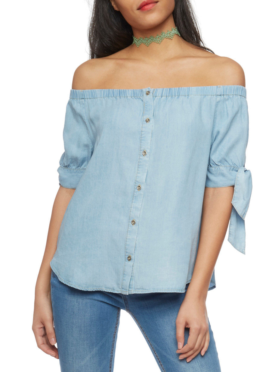 Off the Shoulder Denim Button Front Top with Tie Sleeves